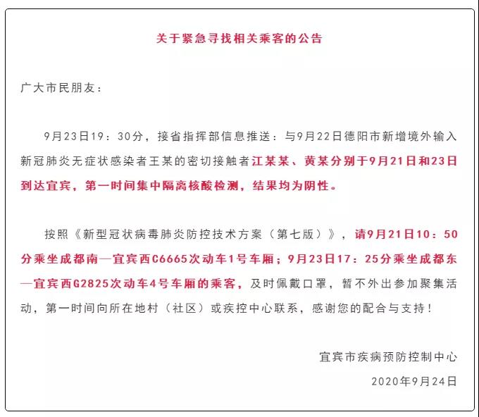 9月23日19:30,接四川省指揮部信息推送:與9月22日德陽市新增境外輸入新冠肺炎無癥狀感染者王某的密切接觸者江某某、黃某分別于9月21日和23日到達宜賓。