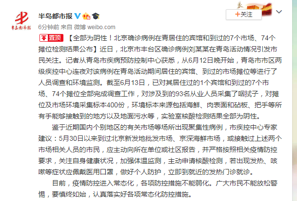 全部為陰性!北京確診病例在青島居住的賓館和到過(guò)的7個(gè)市場(chǎng)、74個(gè)攤位檢測(cè)結(jié)果公布