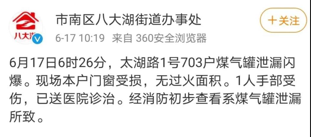 6月17日6時26分,太湖路1號703戶煤氣罐泄漏閃爆?,F(xiàn)場本戶門窗受損,無過火面積。1人手部受傷,已送醫(yī)院診治。經(jīng)消防初步查看系煤氣罐泄漏所致。
