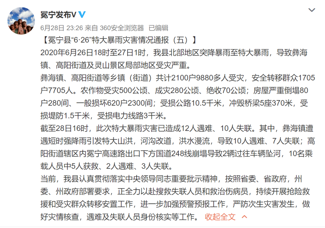 截至28日16時,此次特大暴雨災害已造成12人遇難、10人失聯(lián)。其中,彝海鎮(zhèn)遭遇短時強降雨引發(fā)特大山洪,河溝改道,洪水漫流,導致10人遇難、7人失聯(lián);高陽街道轄區(qū)內(nèi)冕寧高速路出口下方國道248線崩塌導致2輛過往車輛墜河,10名乘載人員中5人獲救、2人遇難、3人失聯(lián)。