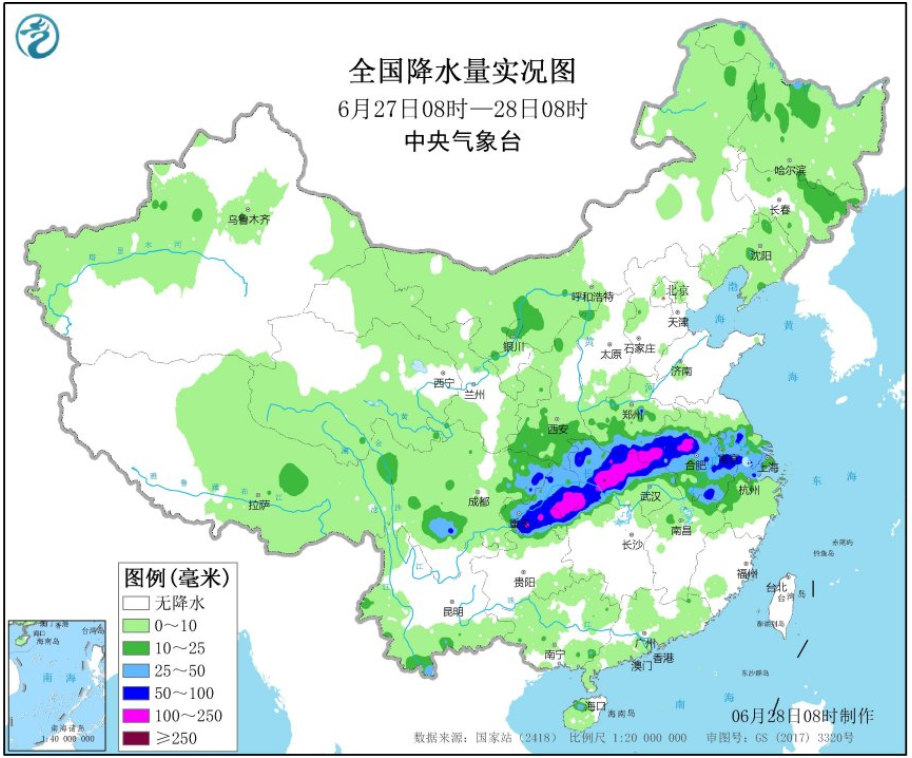 27日,我國的主雨帶位于四川東部、重慶、河南南部、安徽、江蘇南部、上海到浙江北部,其中重慶南部、湖北西南部和北部、河南東南部和安徽西北部出現(xiàn)了100毫米以上的大暴雨。