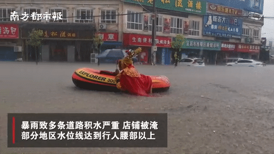 6月27日,湖北宜昌,暴雨致多條道路積水嚴重、店鋪被淹,部分地區(qū)水位線達到行人腰部以上。有網(wǎng)友拍到了“孫悟空”劃皮劃艇救人的畫面,引起熱議。