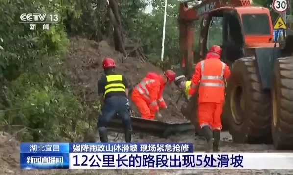 周六(27日),湖北宜昌遭遇短時強降雨天氣。暴雨導致宜昌市點軍區(qū)沿江254省道譚艾路路段發(fā)生山體滑坡,道路被阻,塌方路段總長大約12公里。