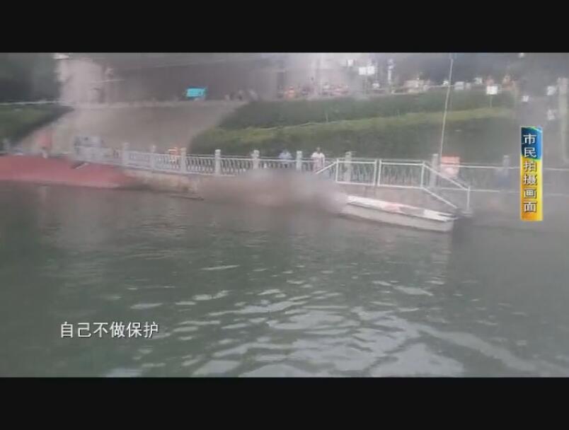 從目擊者拍攝的視頻可以看到,當時水上派出所的船只已經(jīng)??吭阽呓粯蚰系臉虻紫拢幻贻p男子躺在臺階處,沒有穿戴任何的救生裝備。