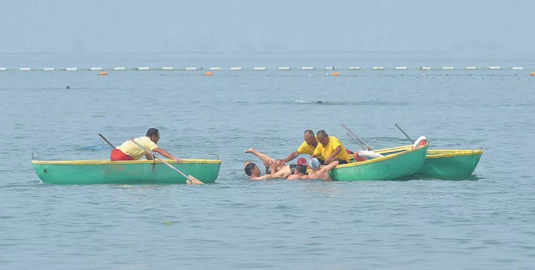 7月8日上午,第一海水浴場突發(fā)險情。8時53分,海面上傳來呼救聲。在海面執(zhí)勤的救生人員發(fā)現(xiàn)險情后,急忙向不遠(yuǎn)處的遇險人員靠攏。