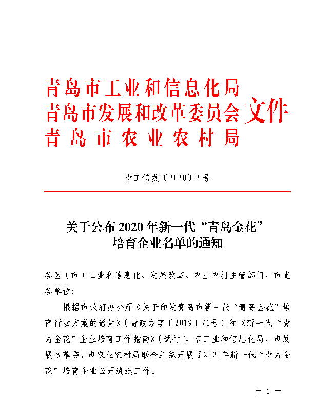 根據(jù)市政府辦公廳《關于印發(fā)青島市新一代“青島金花”培育行動方案的通知》〔青政辦字〔2019〕71號)和《新一代“青島金花”企業(yè)培育工作指南》〔試行,市工業(yè)和信息化局、市發(fā)展改革委、市農業(yè)農村局聯(lián)合組織開展了2020年新一代“青島金花”培育企業(yè)公開—選工作。