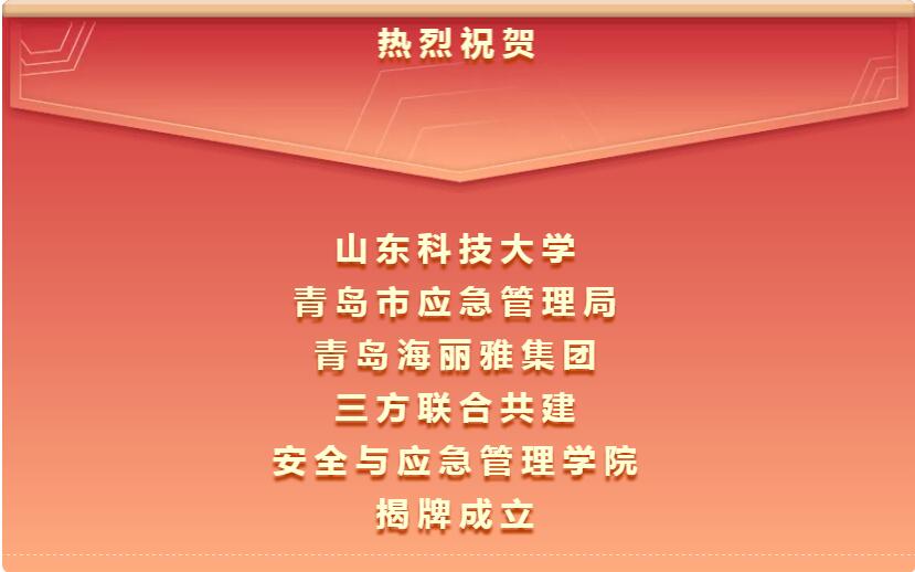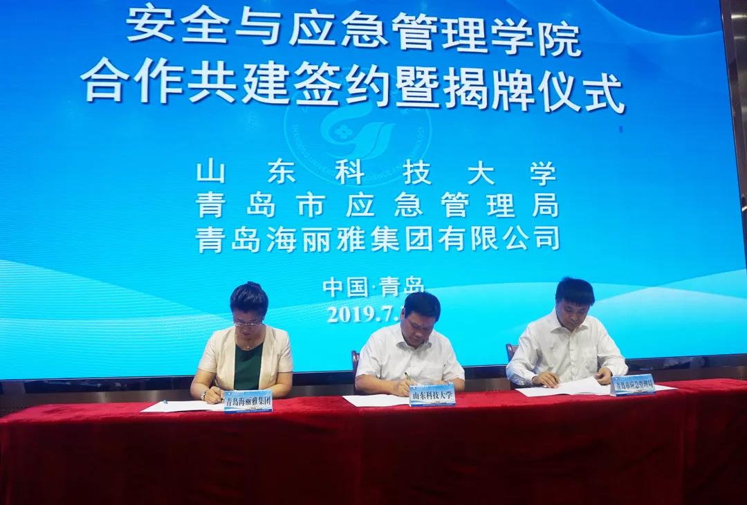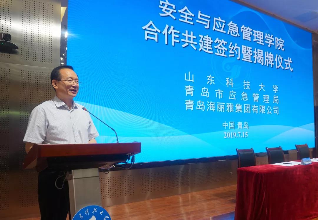 2019年7月15日,山東科技大學(xué)、青島市應(yīng)急管理局、青島海麗雅集團三方聯(lián)合共建的“安全與應(yīng)急管理學(xué)院”舉行揭牌儀式。中央黨校(國家行政學(xué)院)應(yīng)急管理培訓(xùn)中心(中歐應(yīng)急管理學(xué)院)主任(院長)/中國應(yīng)急管理學(xué)會副會長馬寶成、山東科技大學(xué)黨委書記羅公利、 青島市政府副秘書長萬建忠、青島市應(yīng)急管理局局長張建剛、青島海麗雅集團董事長張旭明出席會議。