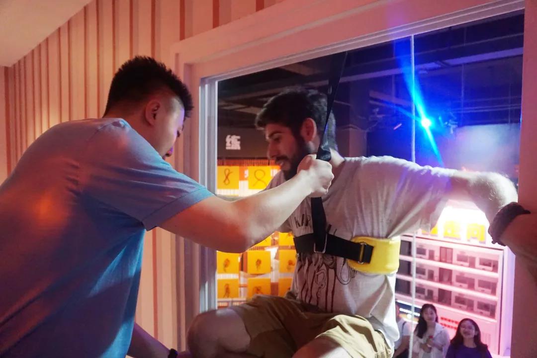 留學(xué)生進(jìn)行高層火災(zāi)緩降逃生、結(jié)繩自救體驗。