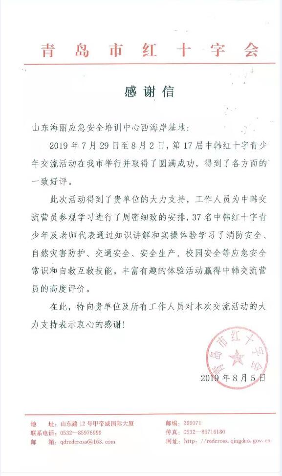 8月6日,青島紅十字會(huì)為感謝西海岸基地在7月30日下午對(duì)“第17屆中韓紅十字青少年交流活動(dòng)",進(jìn)館體驗(yàn)環(huán)節(jié)的精彩講解和周到服務(wù),特發(fā)來感謝信。